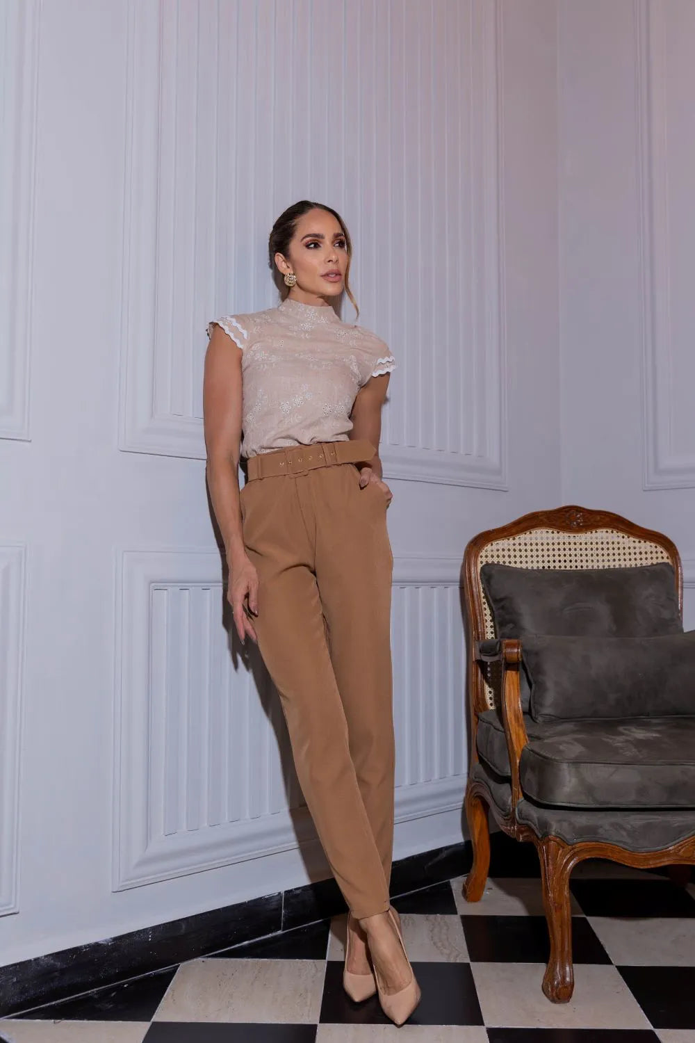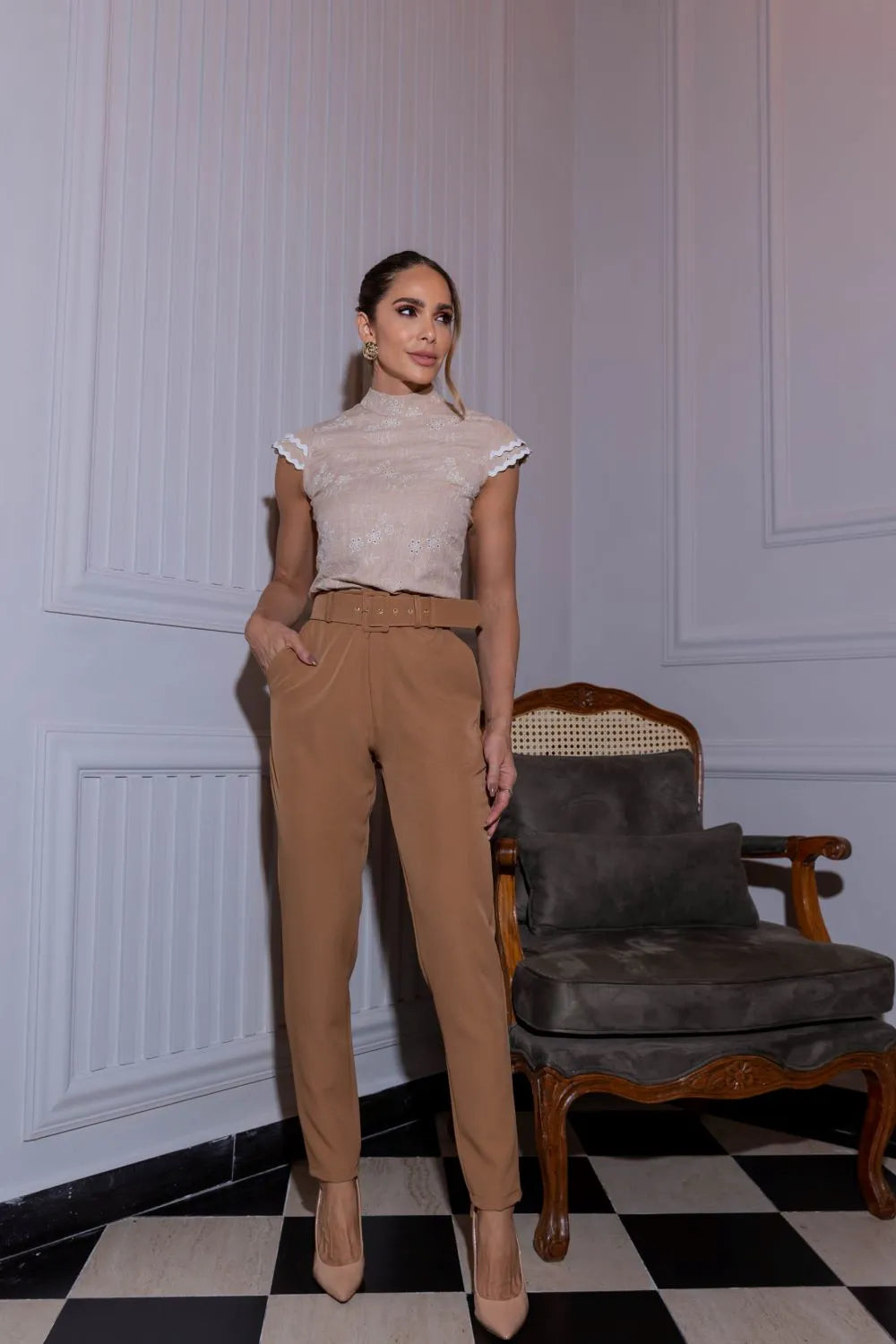 Blusa confeccionada em tecido leve, com bordados em cor contraste e detalhes vazados que trazem delicadeza e sofisticação à peça. Possui gola alta estruturada com fechamento posterior, mangas curtas com acabamento em sianinha aplicada, um detalhe clássico que valoriza o design da peça. A modelagem reta garante conforto e versatilidade.