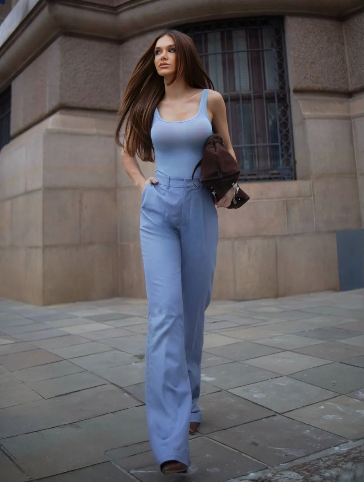 A calça Catarina é uma peça sofisticada, perfeita para usar em looks elegantes e atemporais.