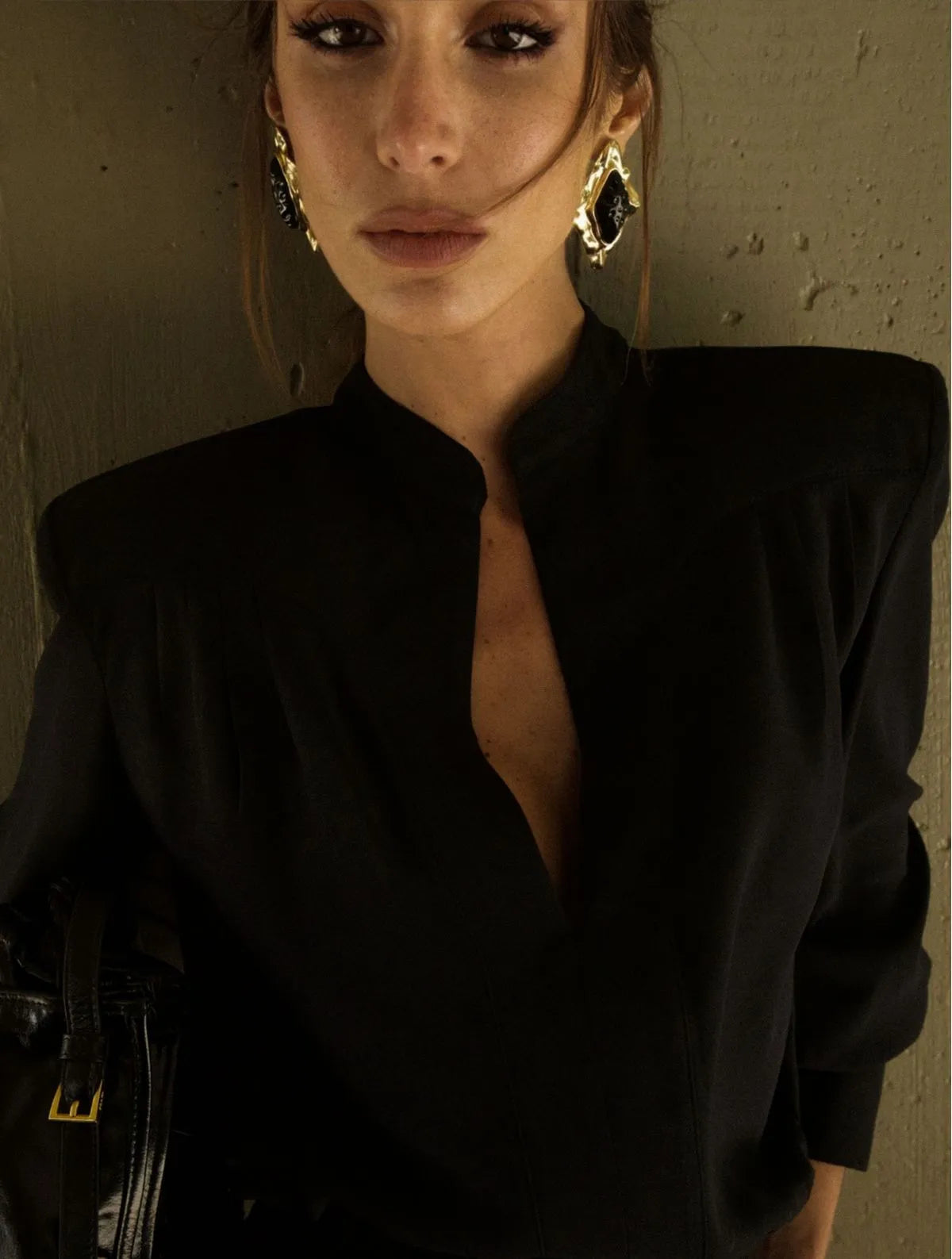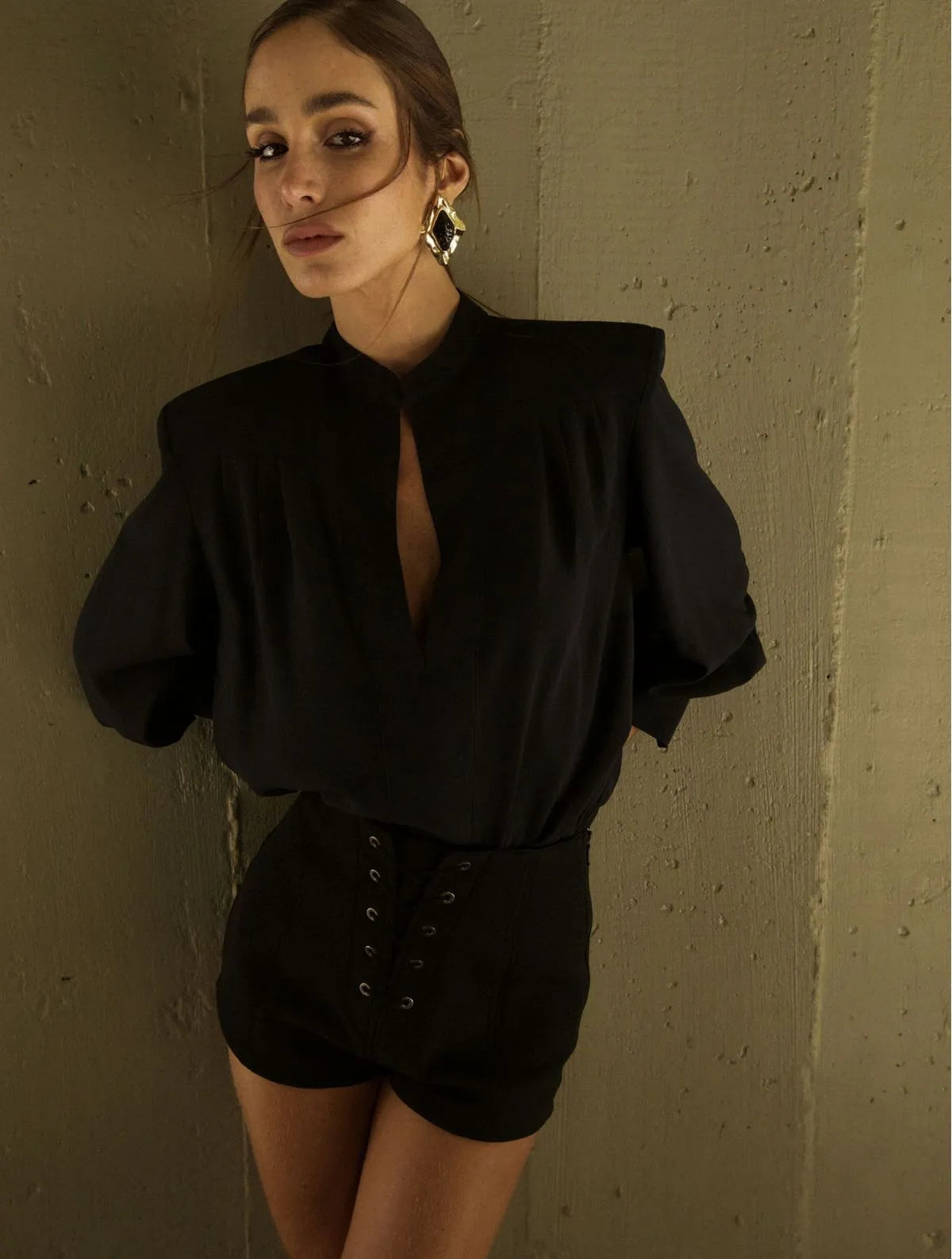 Apresenta mangas longas levemente bufantes, decote em 'V' com detalhe em patô e ombreiras.