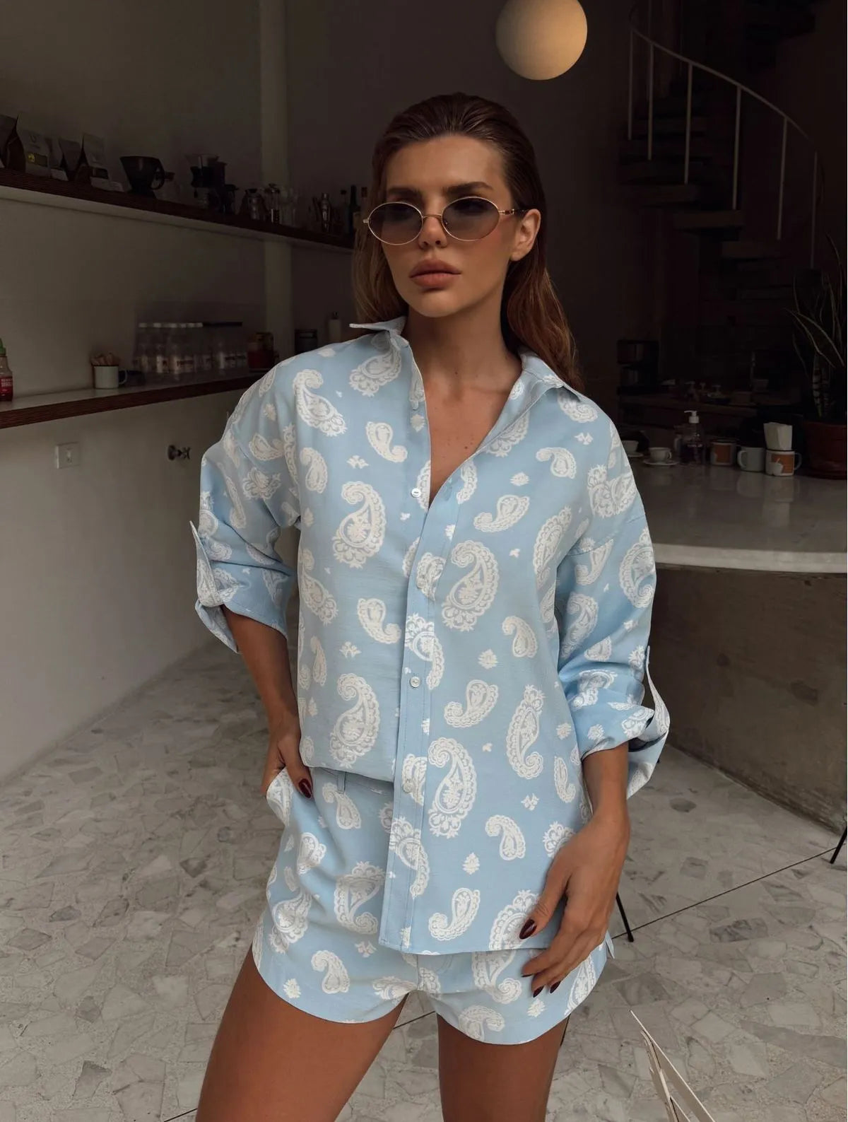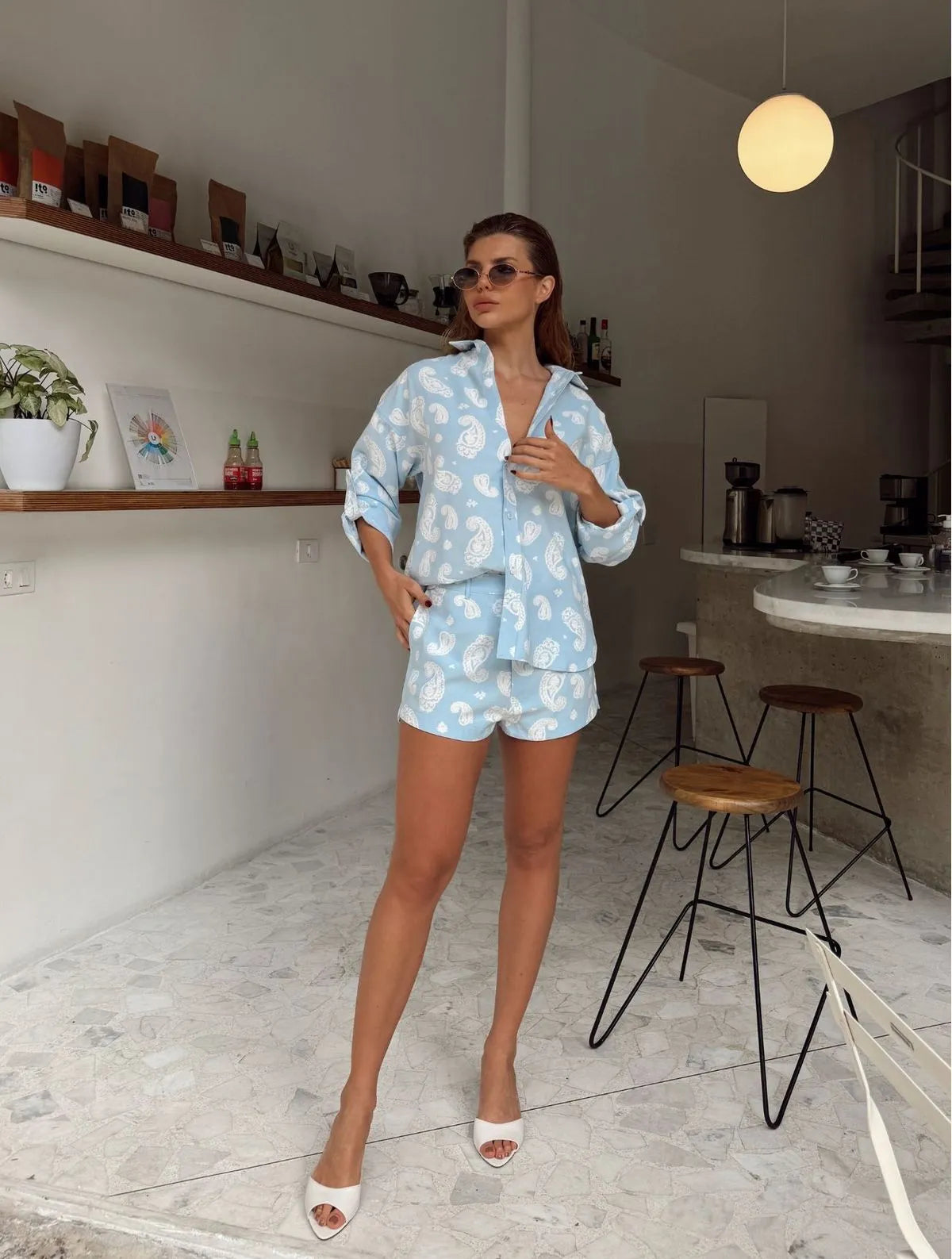 O conjunto Betina é confeccionado em crepe e composto por short e camisa.