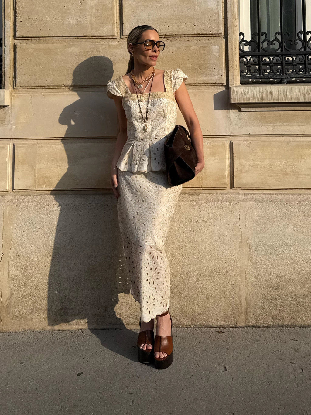 - Recorte peplum com pregas na cintura, acentuando a silhueta com delicadeza.
