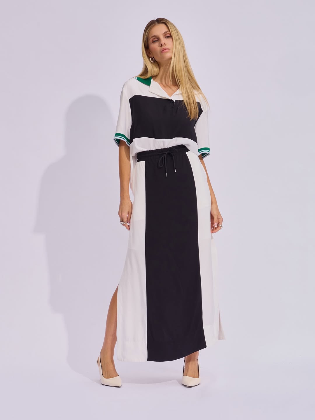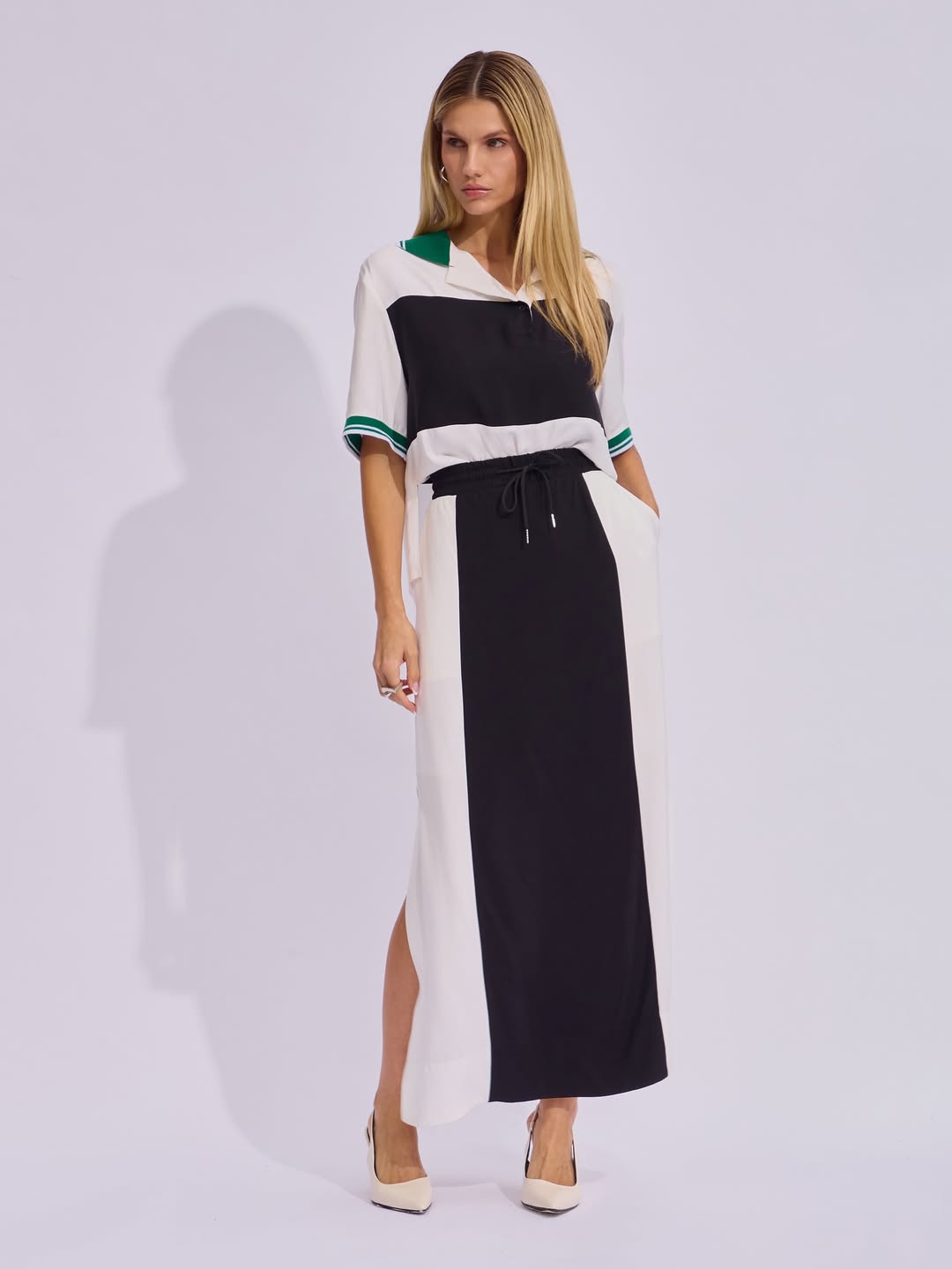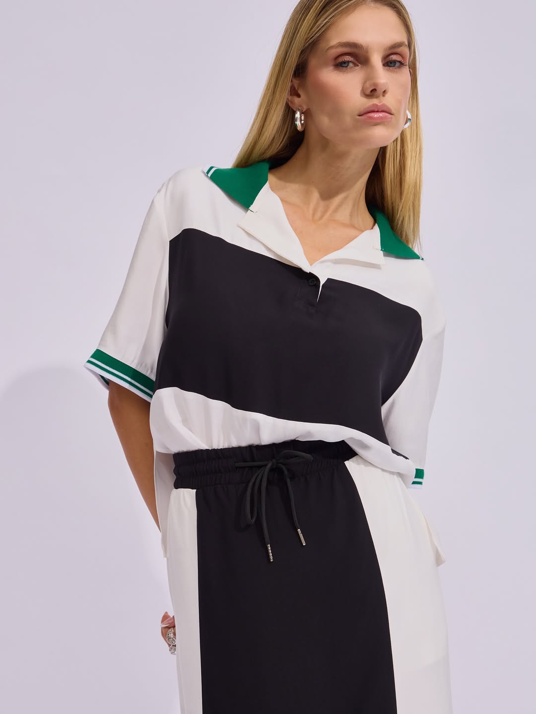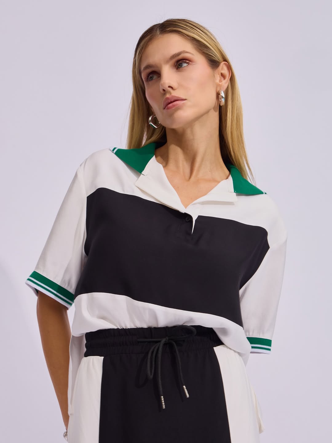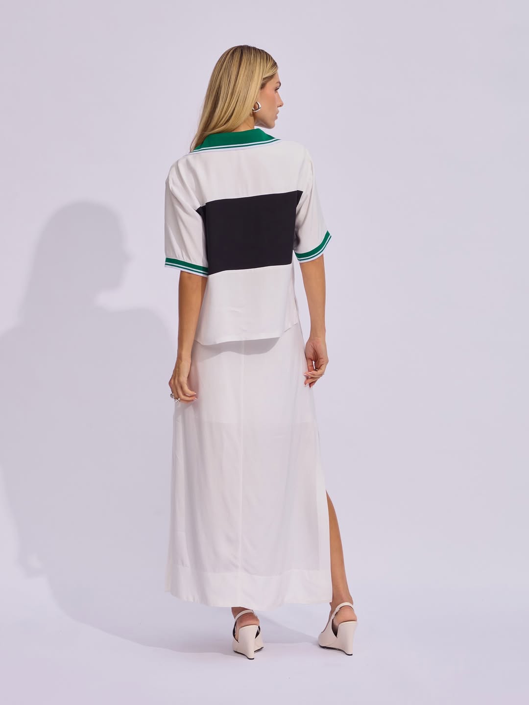 Confeccionado em tecido acetinado, este conjunto é composto por duas peças que aliam design e versatilidade. A camisa, com mangas curtas, apresenta estilo esportivo com gola polo e punhos em retilínea na versão listrada, em contraste. O destaque fica por conta dos recortes em cores contrastantes, que adicionam um toque contemporâneo à peça. Já a saia midi, com cós alto e elástico, possui detalhe em cadarço preto com ponteiras em metal níquel, reforçando a proposta esportiva. Os recortes e as fendas laterais garantem charme extra, além de funcionalidade e liberdade de movimento.