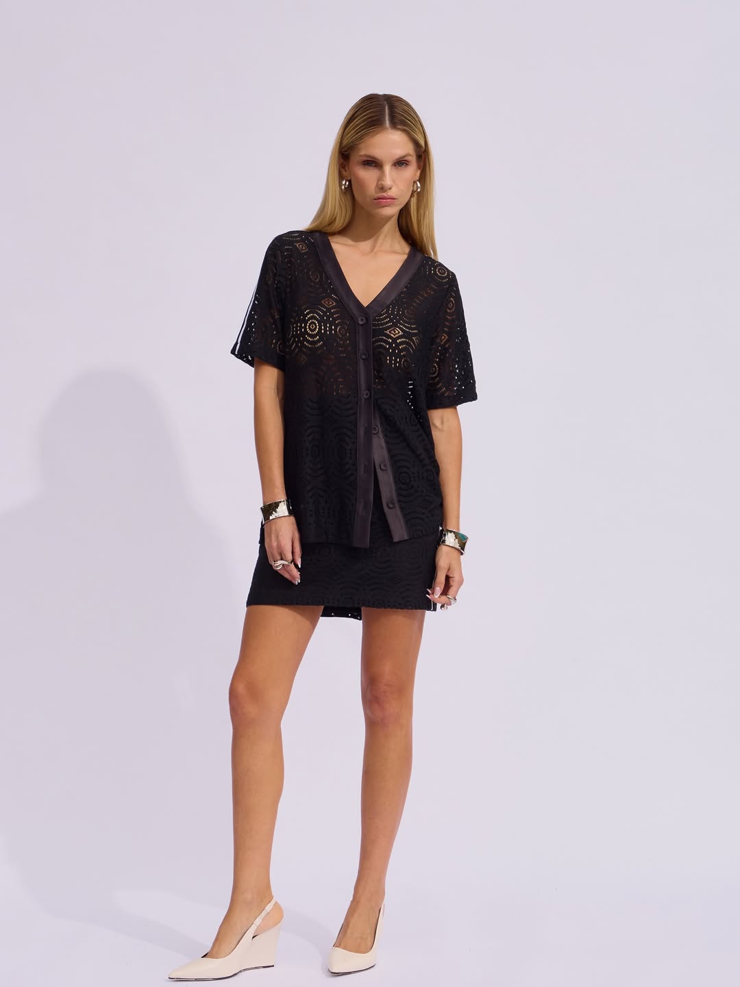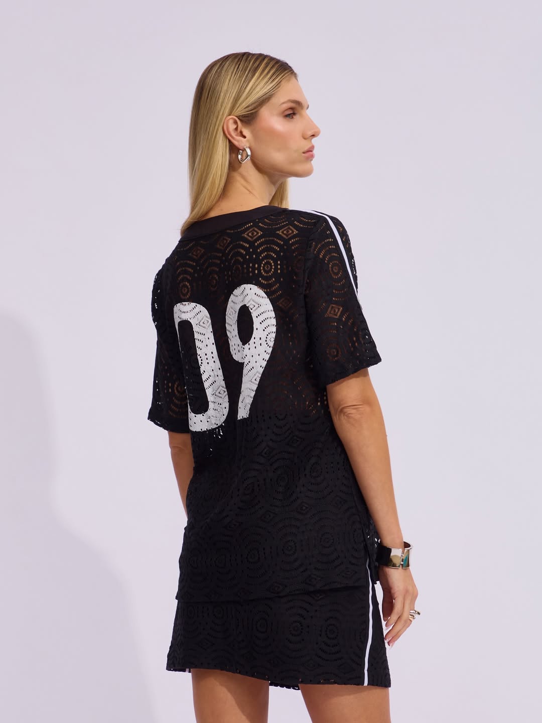 Conjunto atemporal e super cool, confeccionado em renda com detalhes em crepe satin, traz nas costas um silk com numeral e fita galão bicolor em preto e branco, traduzindo a modernidade do look. A camisa apresenta fechamento frontal por botões aparentes e decote V, com shape descontraído e versátil para diferentes ocasiões. A saia acompanha a proposta minimalista e esportiva, com modelagem reta e cós regular.