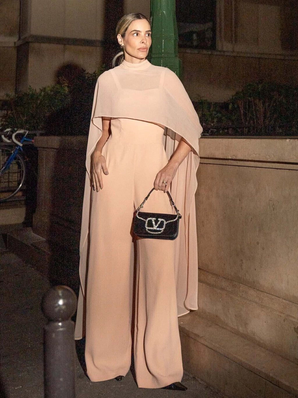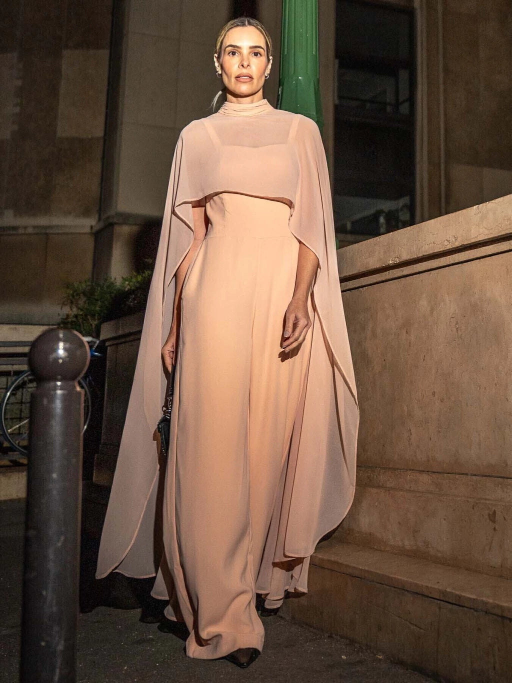 O grande diferencial está na capa fluida em chiffon com comprimento mullet, gola alta drapeada e fechamento por botão encapado, transmitindo elegância e movimento à peça.