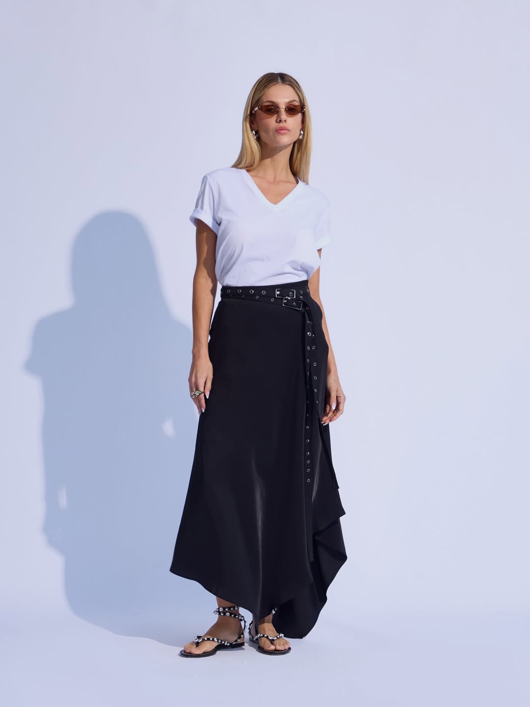 Com estilo contemporâneo e super moderno, a saia midi assimétrica é confeccionada em alfaiataria shine - tecido que traduz beleza, leveza e caimento impecável com fluidez. A modelagem em corte enviesado valoriza a silhueta com movimento, enquanto o fechamento lateral por zíper invisível garante um acabamento refinado. A peça acompanha dois cintos finos no mesmo tecido com fivela retangular e ilhós em grafite, que adicionam um toque urbano e versátil à produção. Ideal para compor looks marcantes com elegância dentro da coleção Urban Lounge.