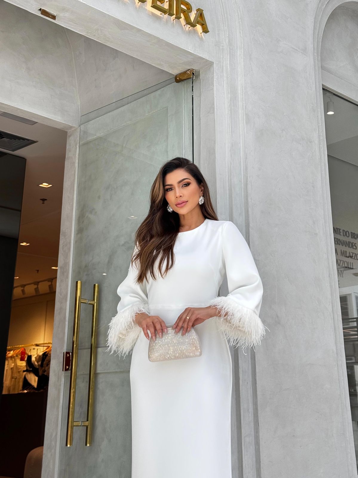 Com gola redonda e mangas longas, apresenta um design clássico e atemporal, enquanto as plumas no punho das mangas adicionam um toque de modernidade e sofisticação. Sua modelagem reta, pouco ajustada ao corpo, e o comprimento midi trazem um equilíbrio perfeito entre estilo e conforto. Possui fenda na parte de trás para maior liberdade ao movimento, seu fechamento é por zíper invisível nas costas.