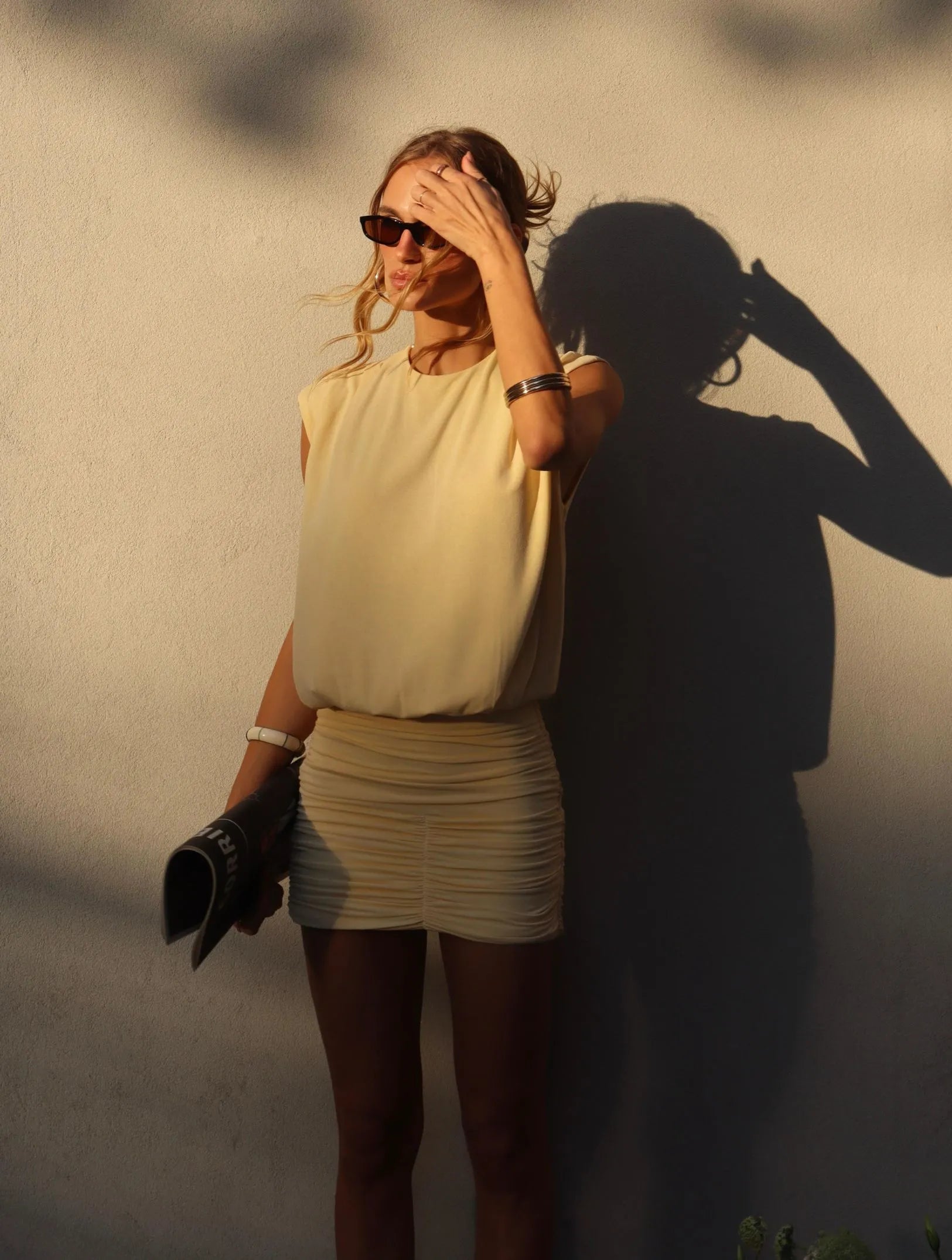 Apresenta ombreiras, decote com gola redonda, modelagem blouse e drapeados na saia.