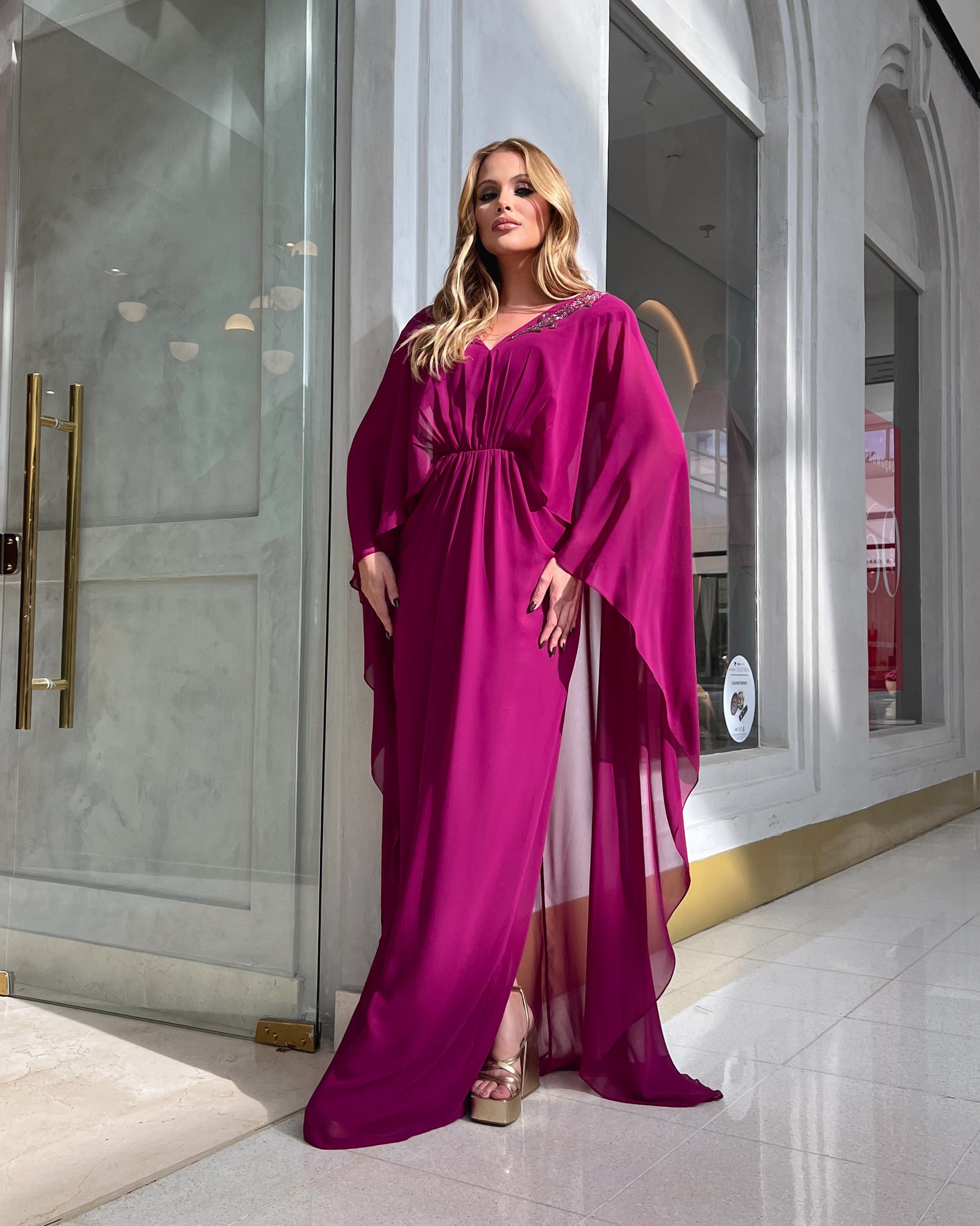 Vestido longo em chiffon leve e fluido, com caimento esvoaçante. Possui decote V profundo e mangas capa alongadas, criando uma estética etérea e elegante. O busto blusê com pregas na cintura e no quadril garante conforto e textura ao look. A saia reta com fenda traseira adiciona movimento fluido ao caminhar. O charme final fica por conta do bordado delicado em vidrilho, que confere brilho na medida certa. Ideal para casamentos, formaturas e eventos noturnos sofisticados. Detalhes da peça: Decote V Manga capa longa Busto blusê com pregas na cintura e no quadril Saia reta com fenda traseira Bordado aplicado em vidrilho Zíper invisível nas costas