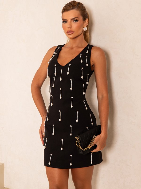 Vestido curto de crepe preto: Um modelo sofisticado com decote "V" e modelagem cavada, proporcionando um visual elegante. O zíper de metal nas costas garante praticidade, enquanto os bordados manuais na frente, com peças em pingente peroladas, acrescentam um toque delicado e exclusivo.omposição: 96% poliéster e 4% elastano. Forro 100% poliéster.