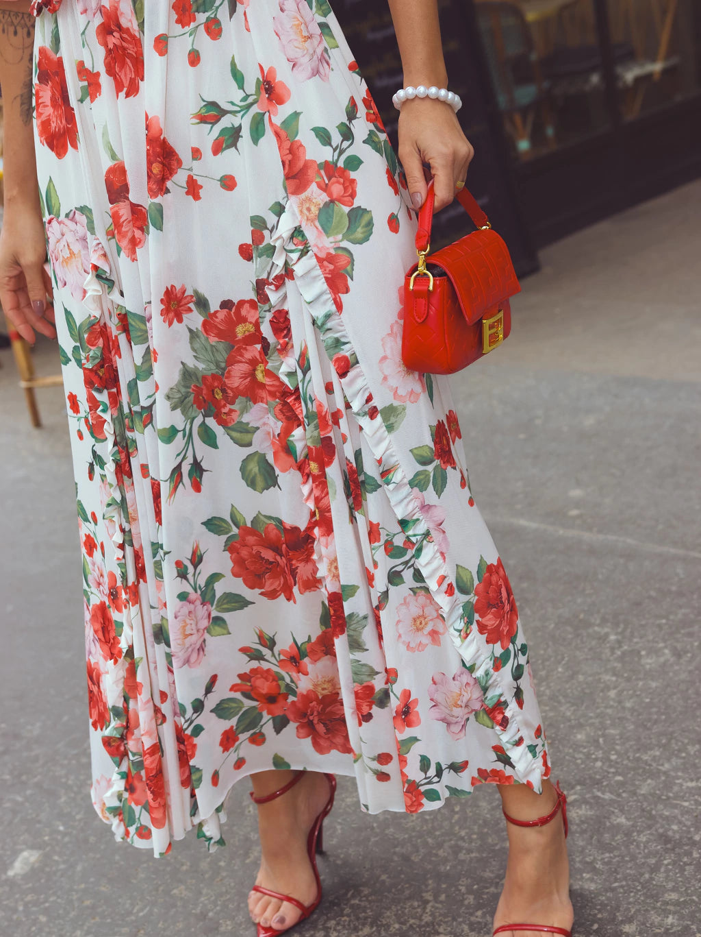 Os detalhes encantadores continuam com a aplicação de babados nos ombros e cintura, além dos botões forrados frontais que valorizam o acabamento. A saia com nesgas e aplicação de babados proporciona movimento fluido e um visual sofisticado.