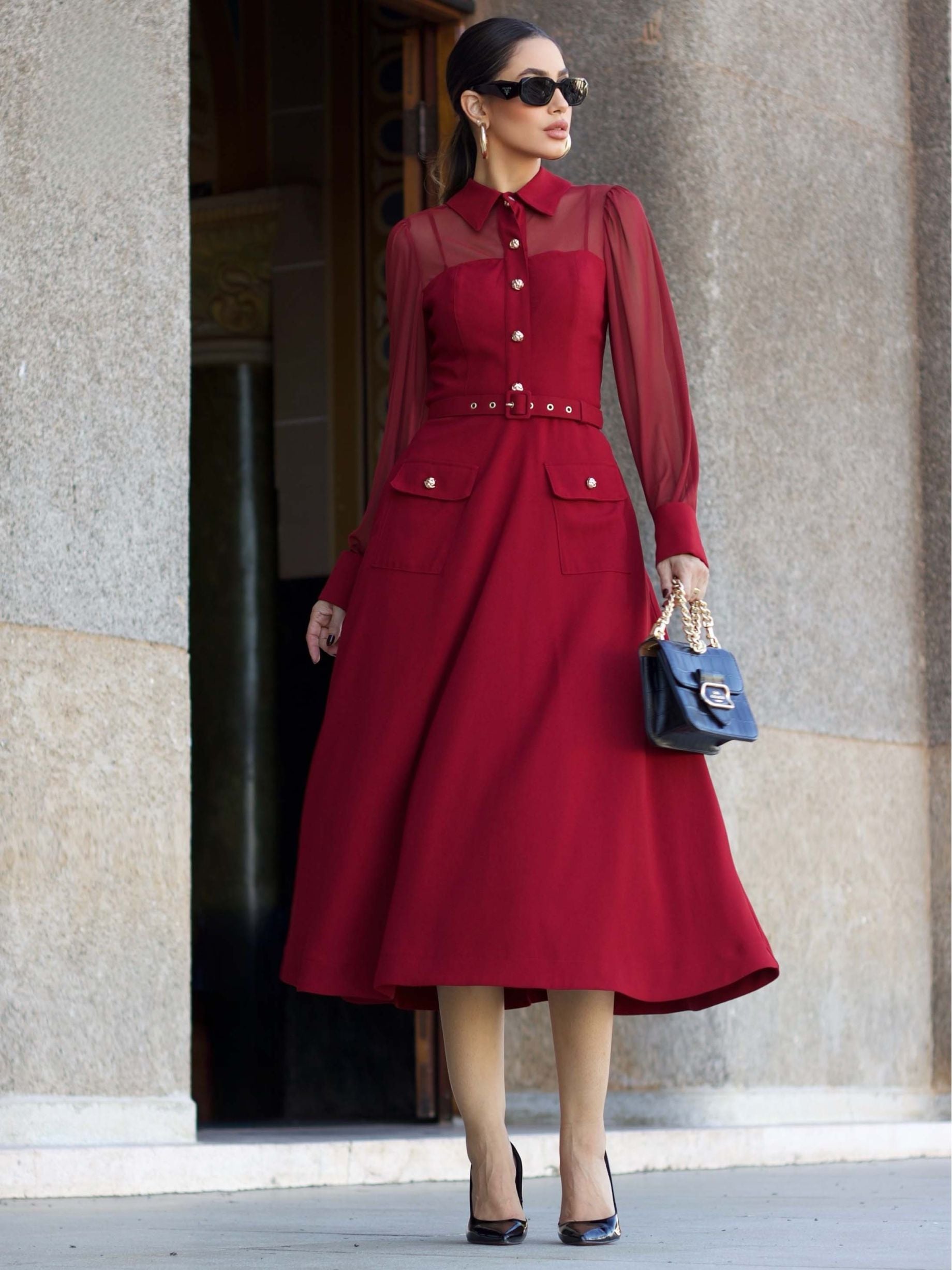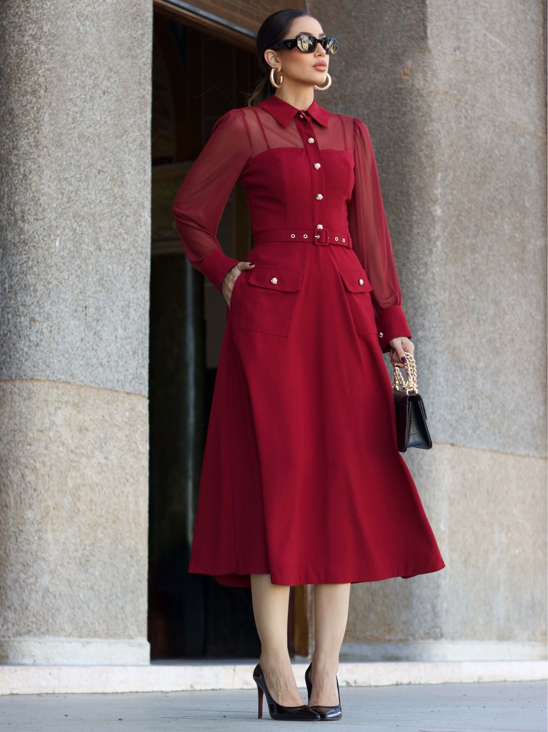 VESTIDO CREPE E TULÊ COM BOLSOS Tecido crepe e tule Modelagem chemise Comprimento midi Manga longa Abotoamento frontal por botões dourados Punho com abotoamento Bolsos frontais Detalhe franzido nos ombros Acompanha cinto Fechamento nas costas por zíper e botão Peça forrada Composição: 100% poliéster Detalhe: 95% poliéster 5% elastano Forro: 95% poliéster 5% elastano