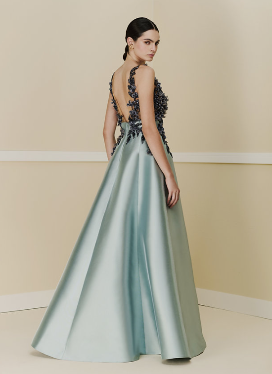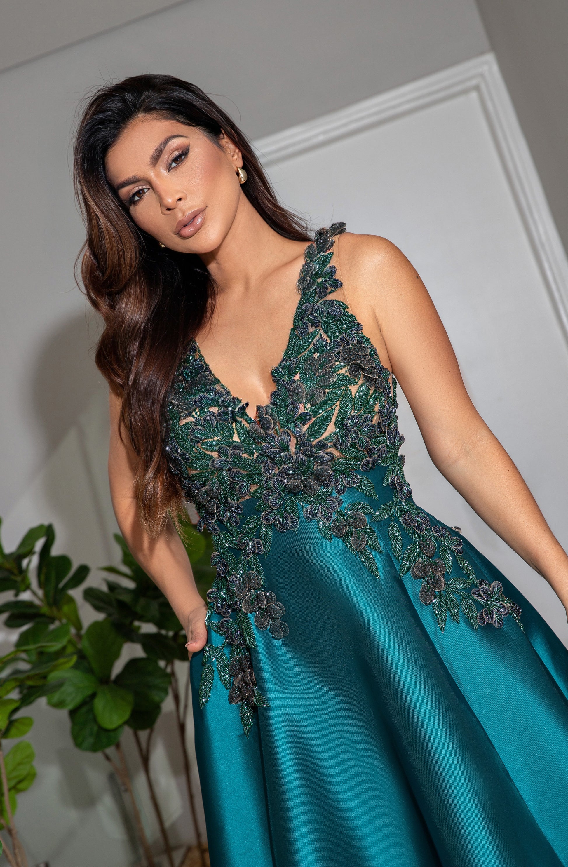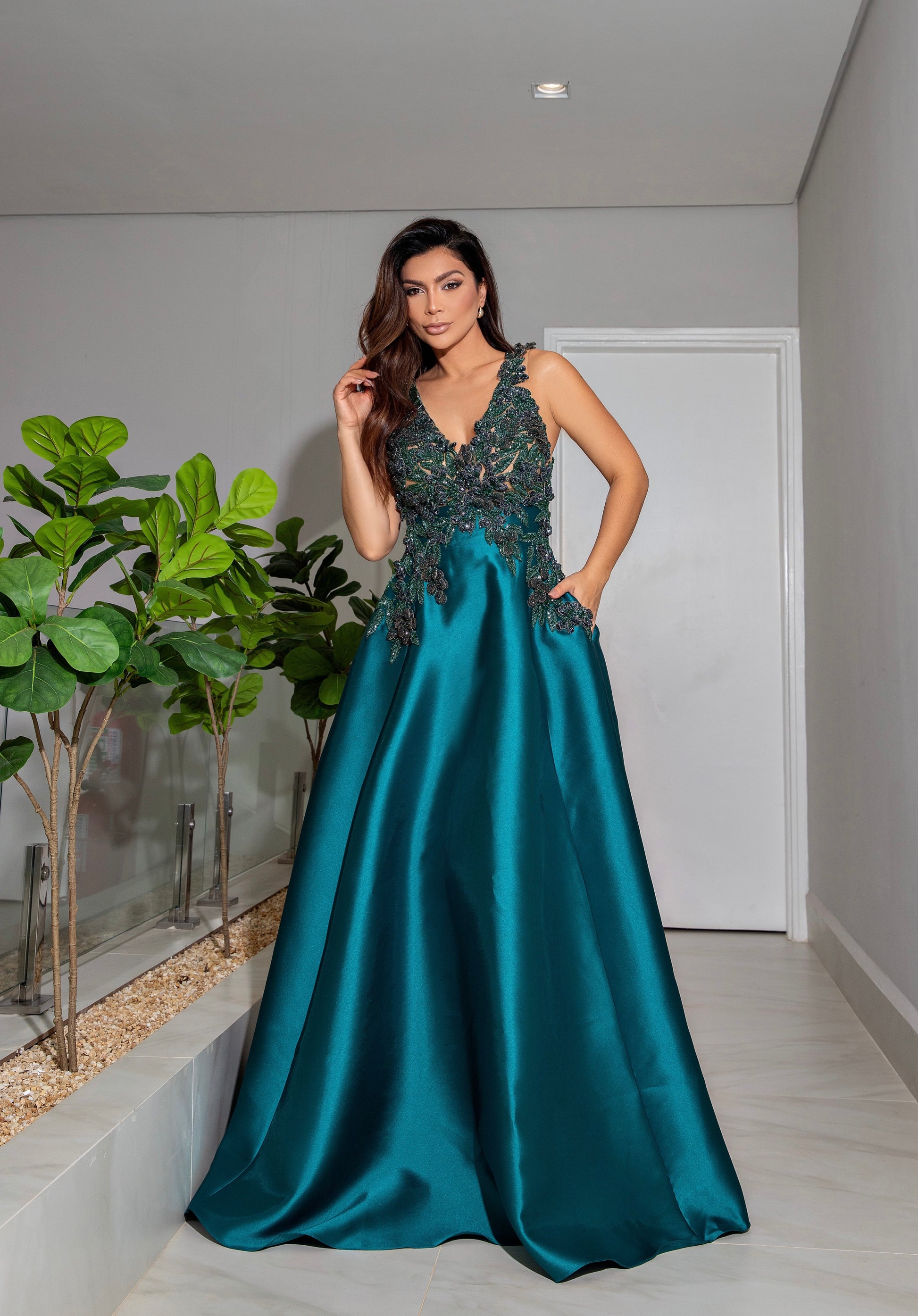 Rico em detalhes, o vestido longo é confeccionado em tecido encorpado que permite uma saia ampla com movimento. Top em tule, com bojo. A peça recebe bordado manual de pedrarias flores 3D e folhas sobre todo o top descendo para a saia nas laterais. Bolsos embutidos e fechamentos com zíper invisível posterior.