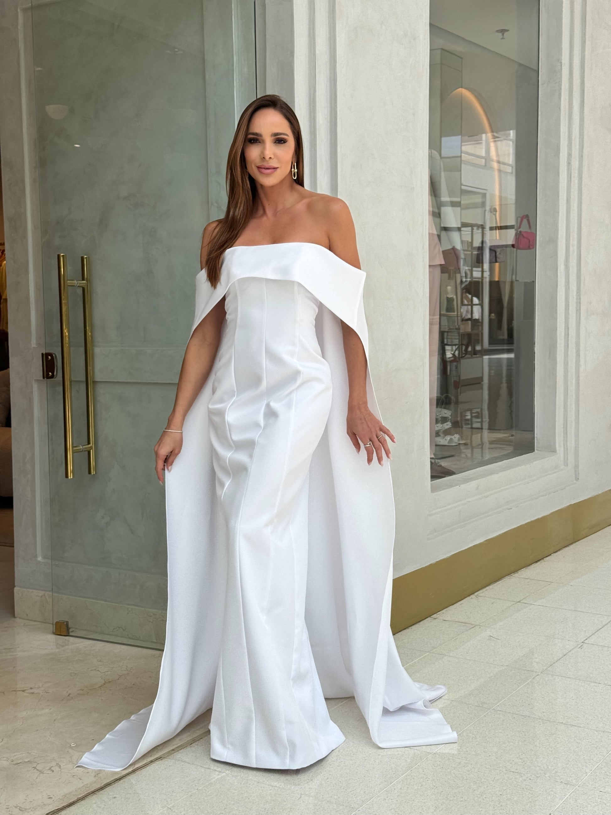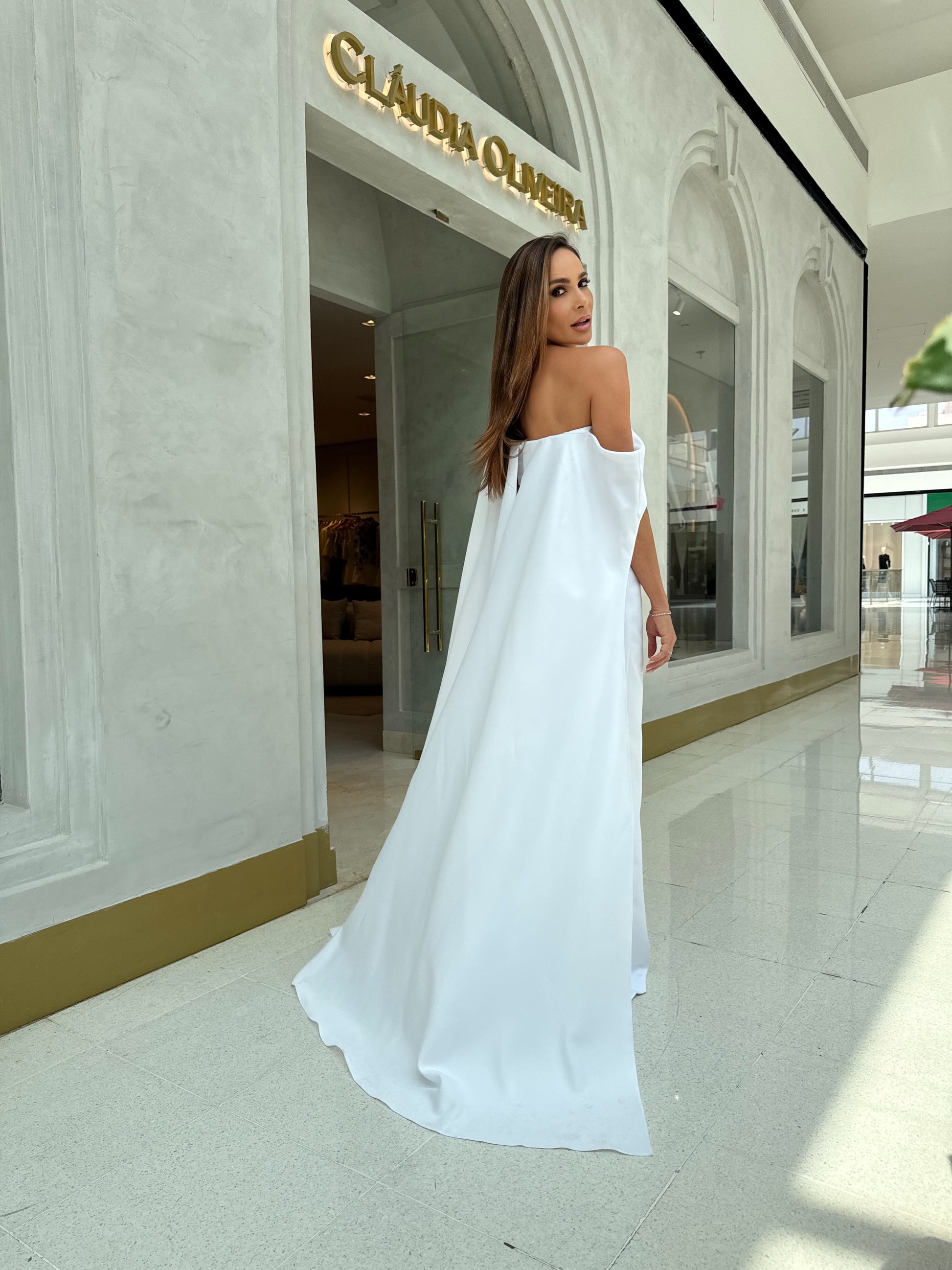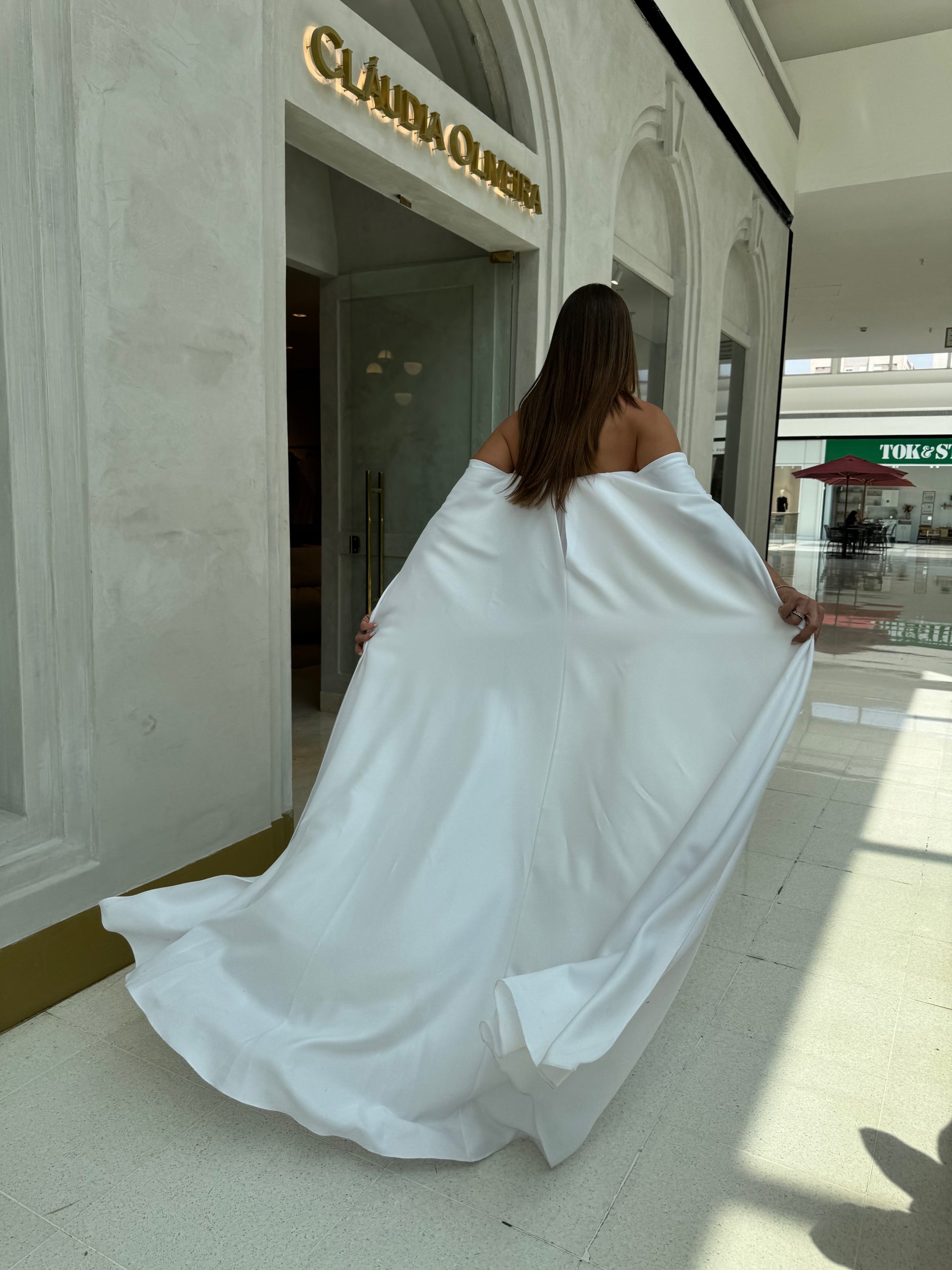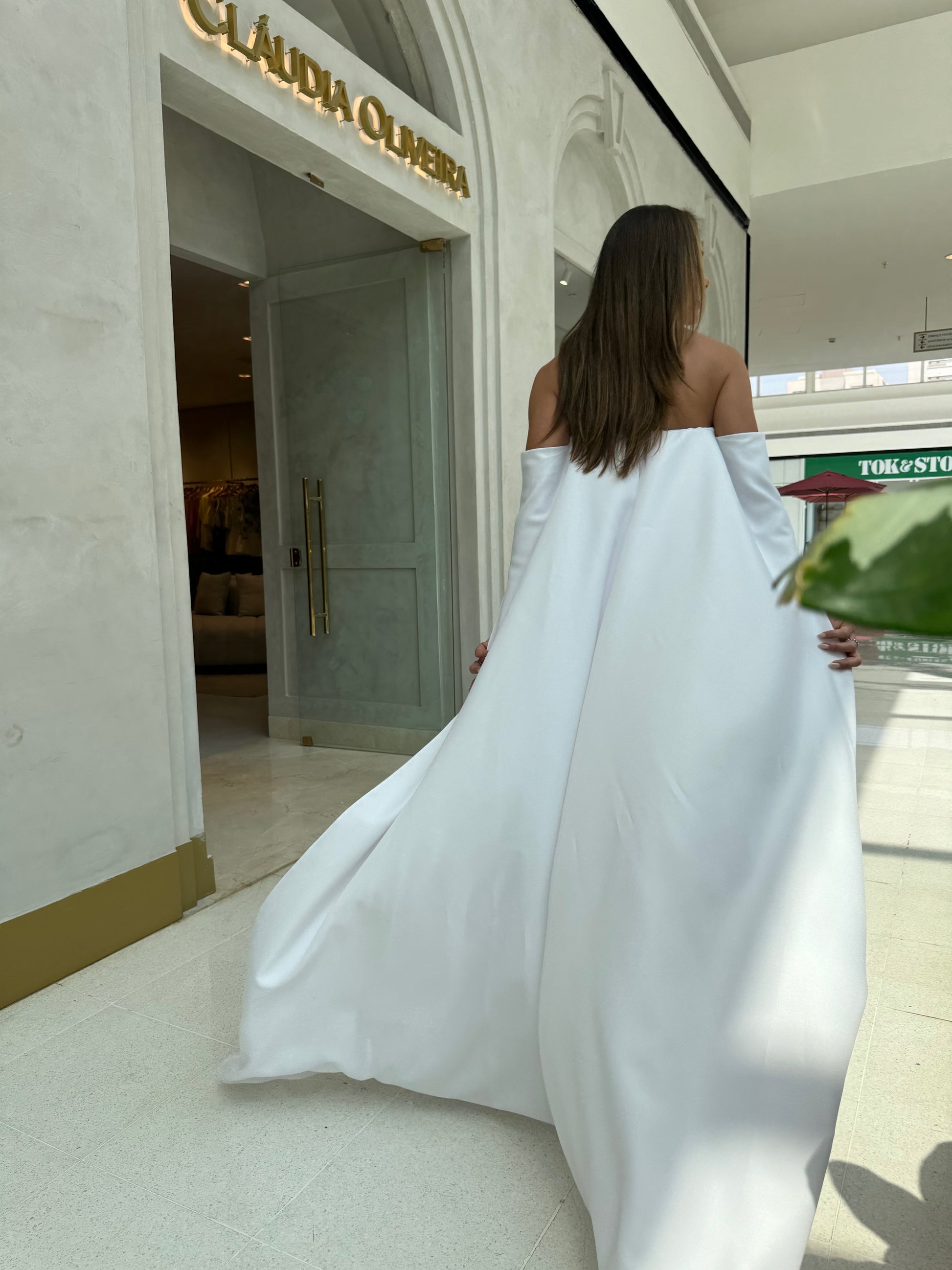 Vestudo M Rodarte , tecido gabardine, corte sereia e capa longa.