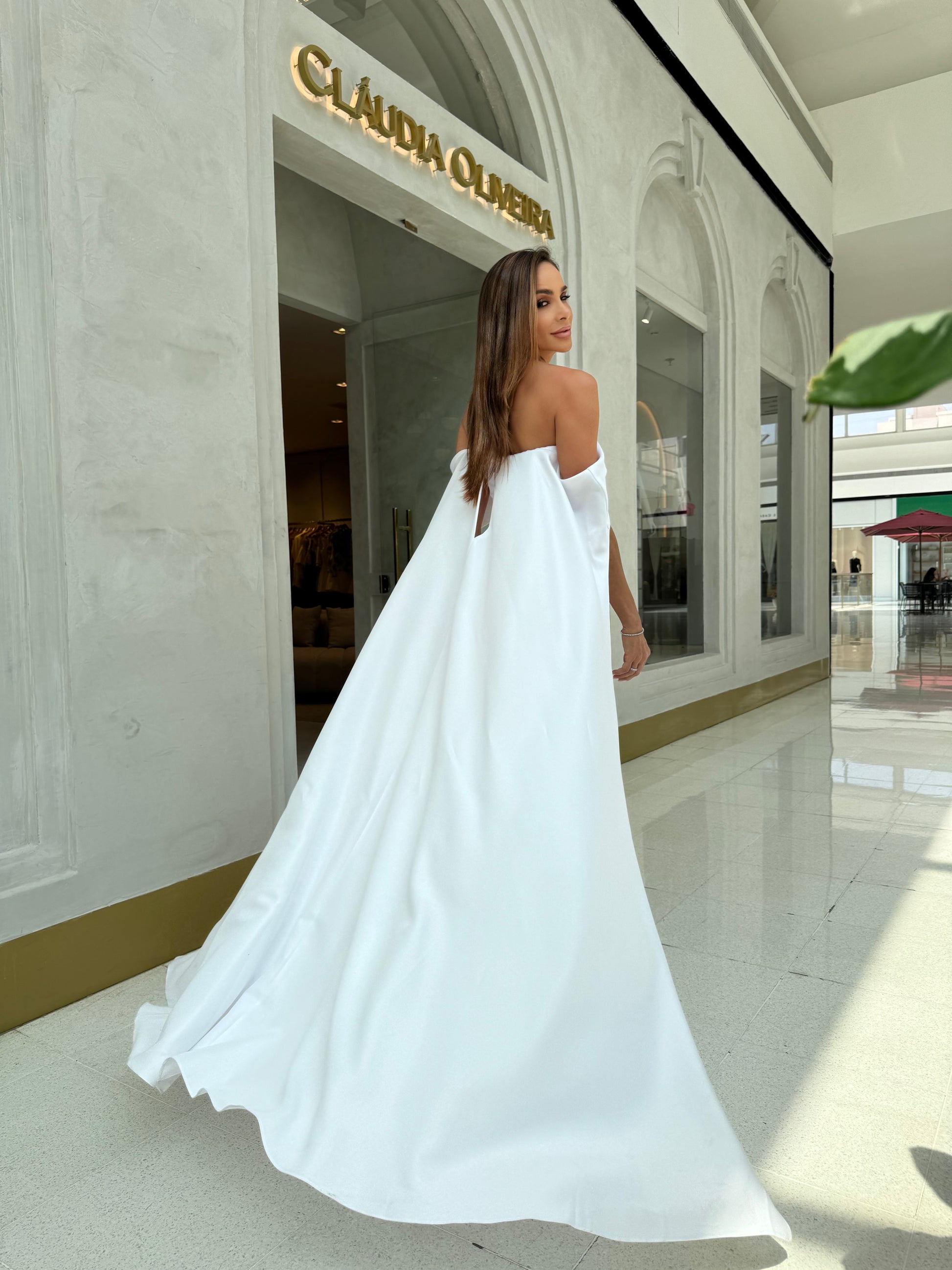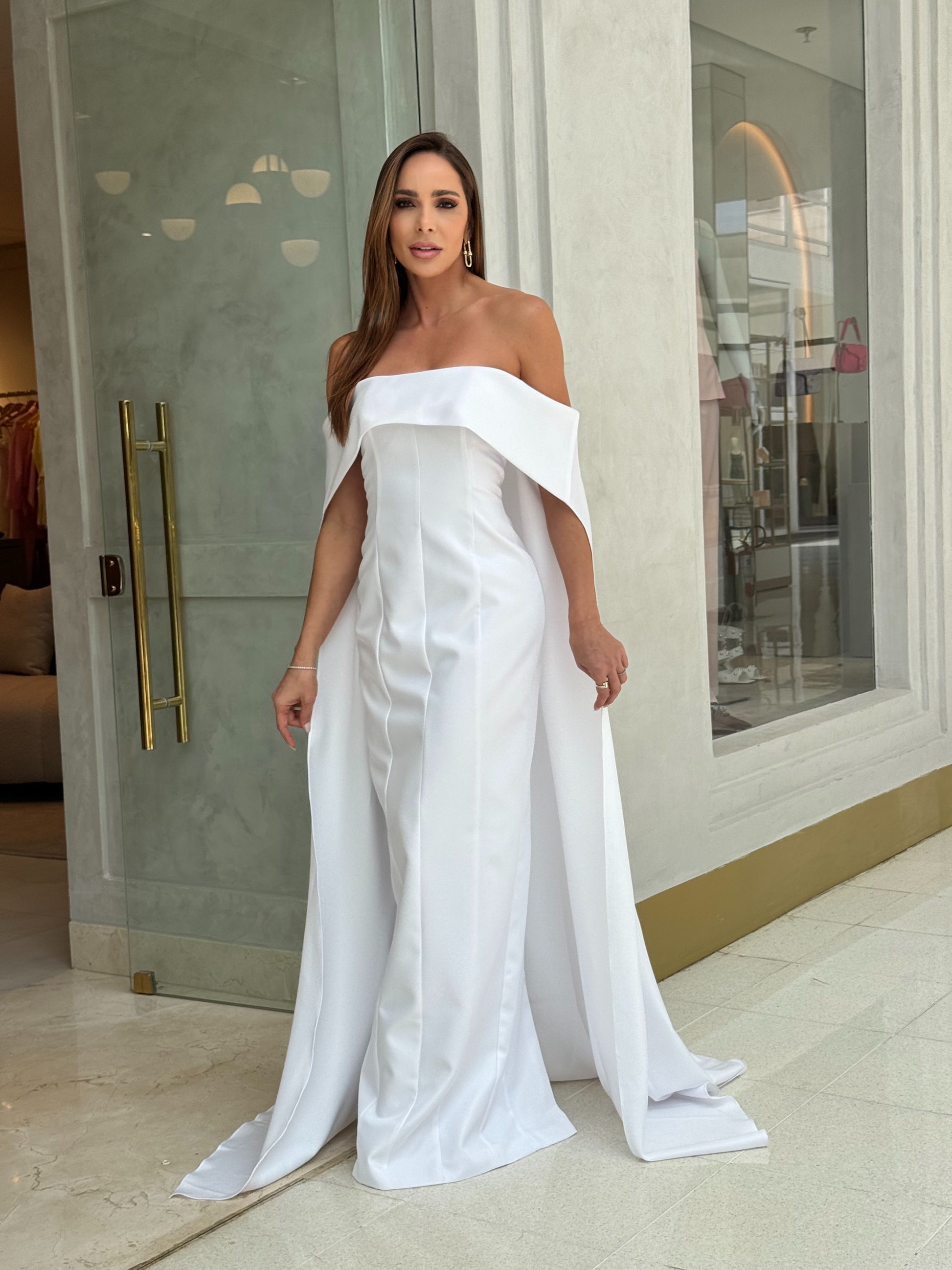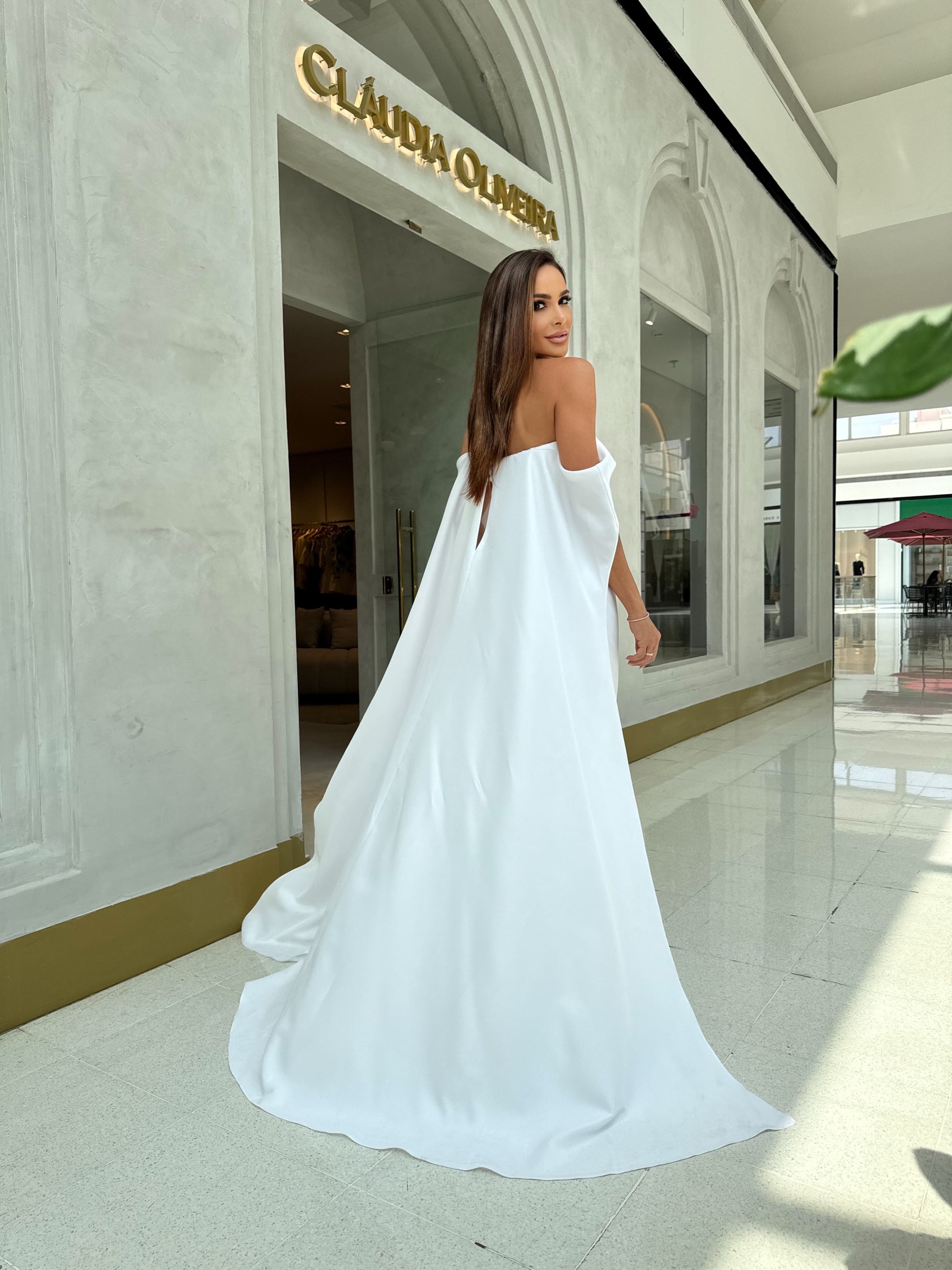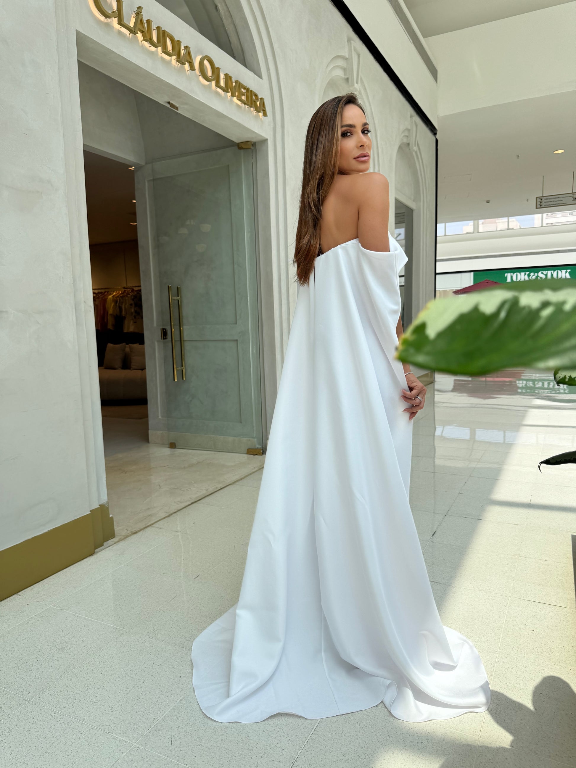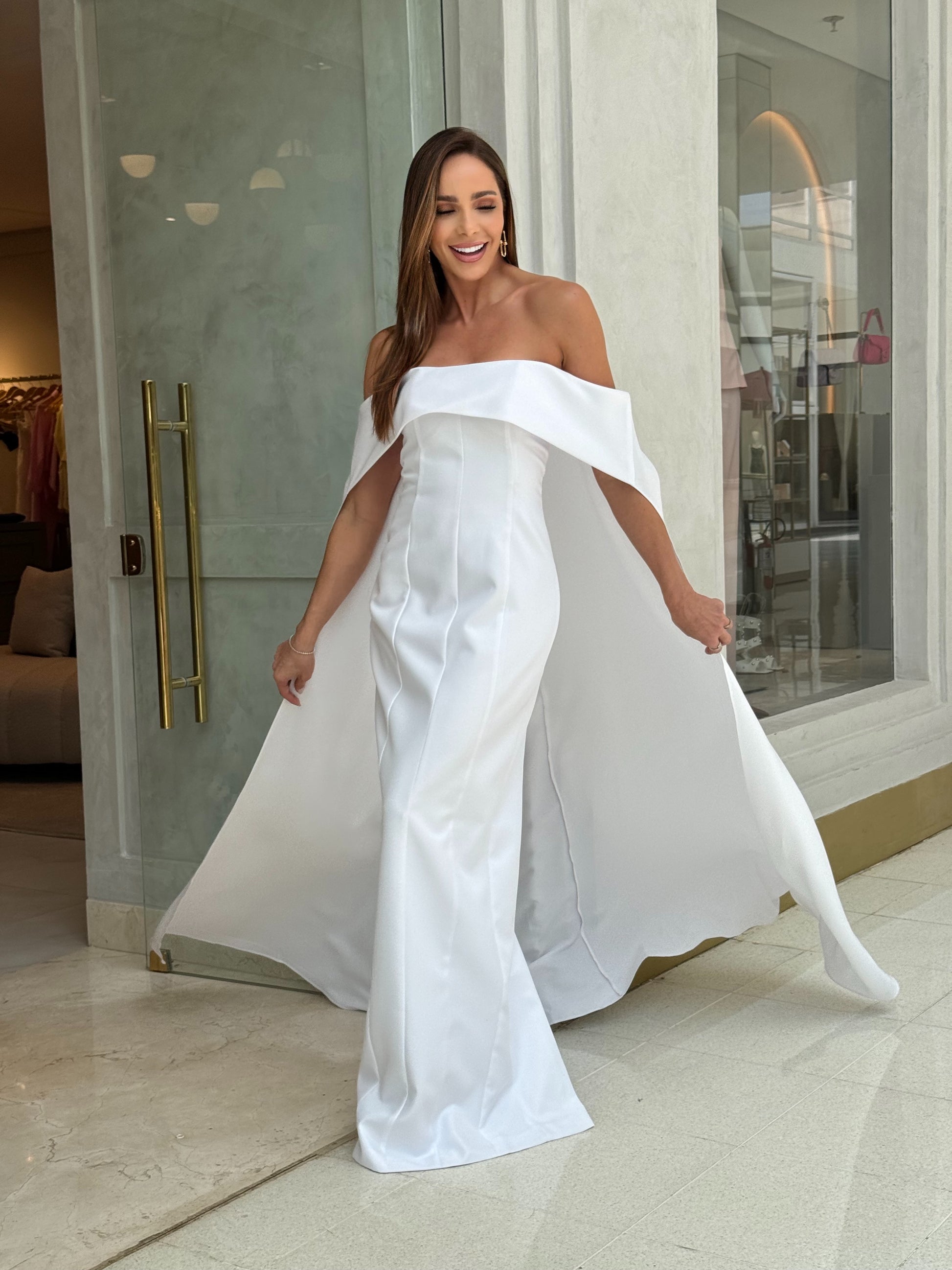 Vestudo M Rodarte , tecido gabardine, corte sereia e capa longa.