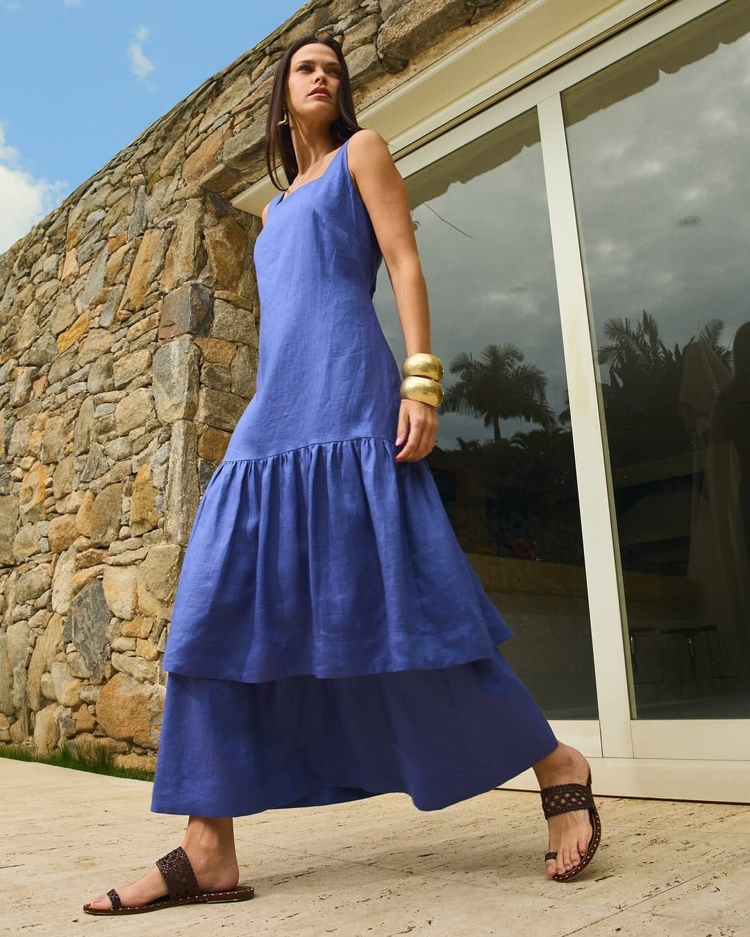Confeccionado em linho 100%, o vestido proporciona toque suave e natural, ideal para diversas ocasiões. Com comprimento midi longo, decote quadrado e babados que valorizam a peça, exibe elegância e charme. Levemente acinturado, acompanha o corpo com fechamento traseiro por zíper e elástico nas costas, garantindo conforto e praticidade.